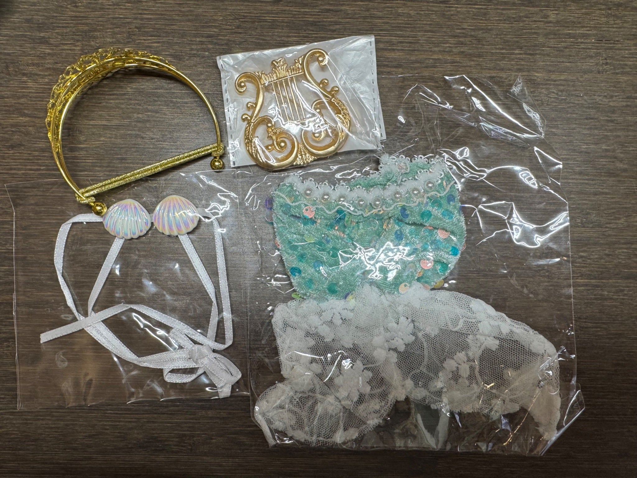 Four pieces: Mermaid Cloth, shell bra, crown, musical instrument